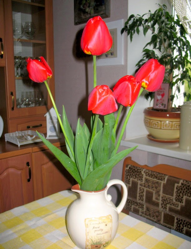 И какой красивый букет ты привезла! Люблю тюльпаны. А может это к лучшему взять хоть на чуть-чуть перерыв от работы.